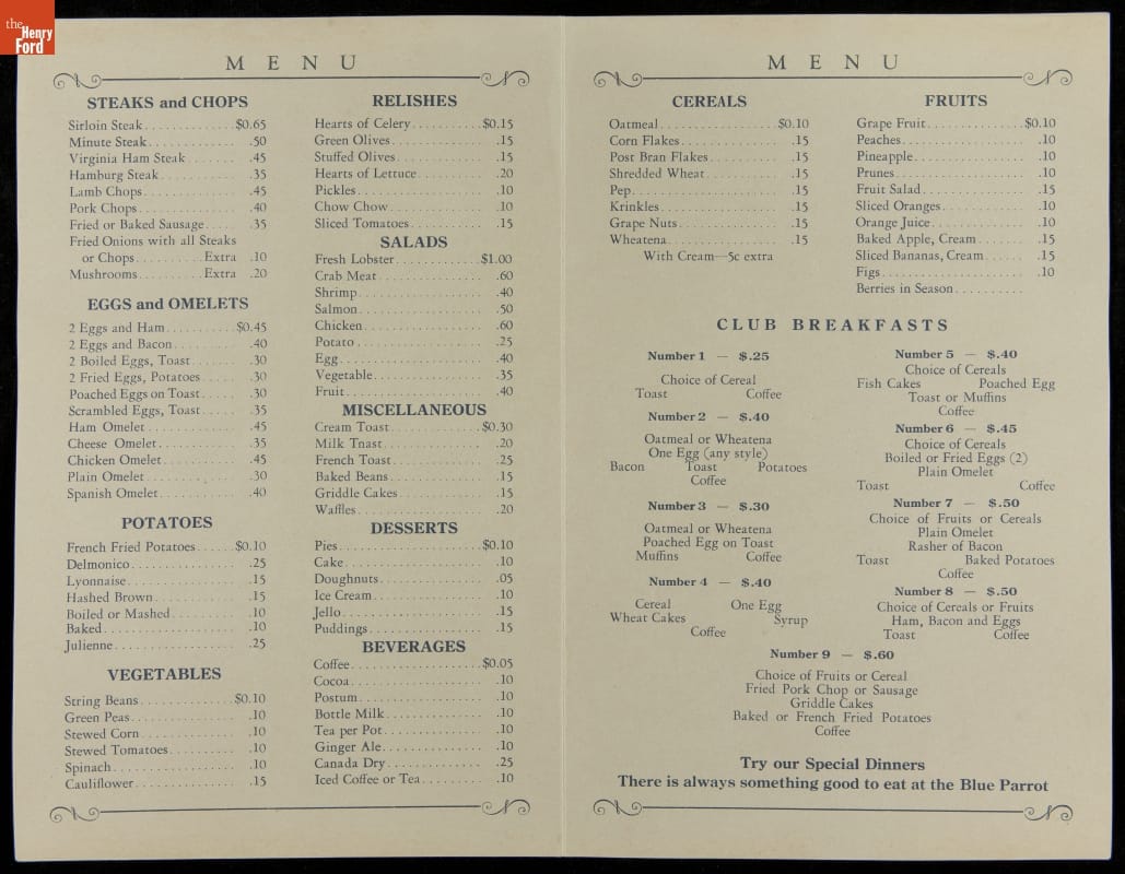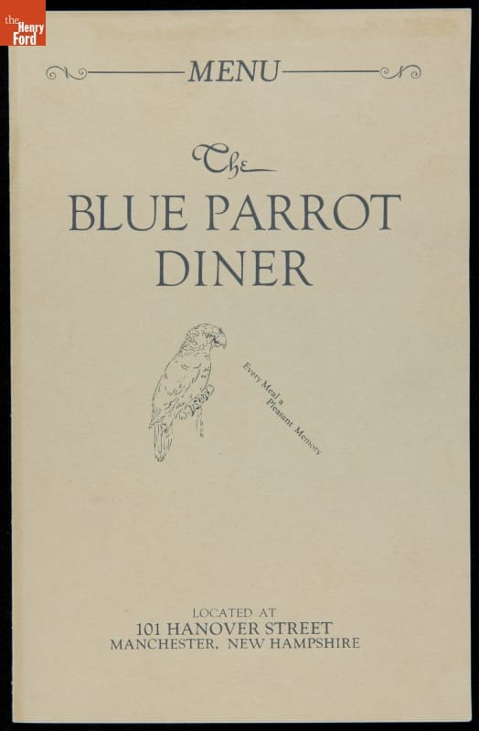 Menu, "Blue Parrot Diner," Manchester, New Hampshire, circa 1928