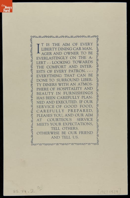 Diners had long appealed to workers by offering quick, simple food at reasonable prices. By the late 1920s, as this menu shows, diner operators were attempting to broaden their appeal to women and their families by promising such enhanced amenities as comfort, hospitality, beauty in furnishings, and carefully prepared foods.