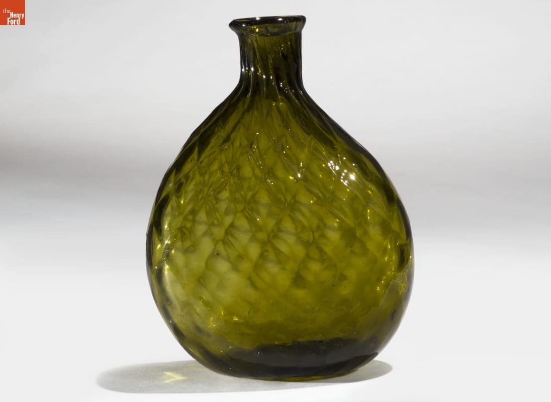 American glass factories produced flasks, like this one, from the late 1700s well into the mid-1800s. The pint-sized flask could hold water but more likely contained alcoholic beverages. Its textured decorative exterior -- formed when the hot glass was dipped into a pattern mold before it was blown -- made the flask easier to grasp. And its flattened shape fit nicely into pockets providing ready access to the liquid refreshment.