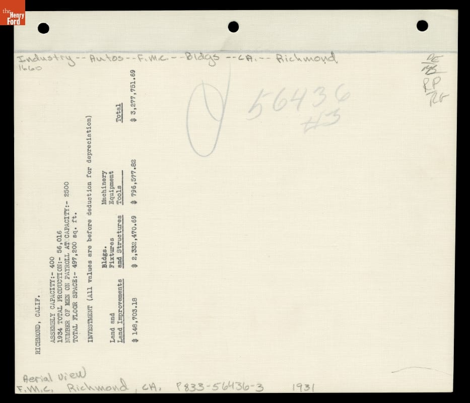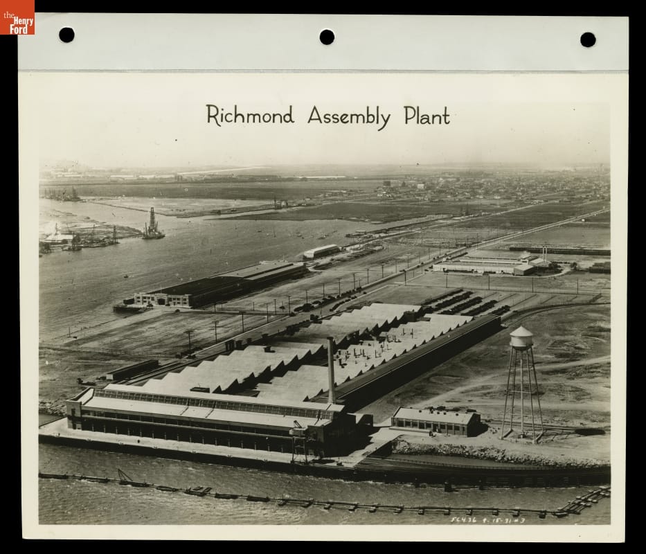 Ford Motor Company opened an Albert Kahn-designed assembly plant in Richmond, California, in 1930. During World War II, employees at the factory built tanks, jeeps, and other military vehicles. Ford closed the Richmond plant in 1956. Today it houses private businesses and a visitor center for Rosie the Riveter / World War II Home Front National Historical Park.