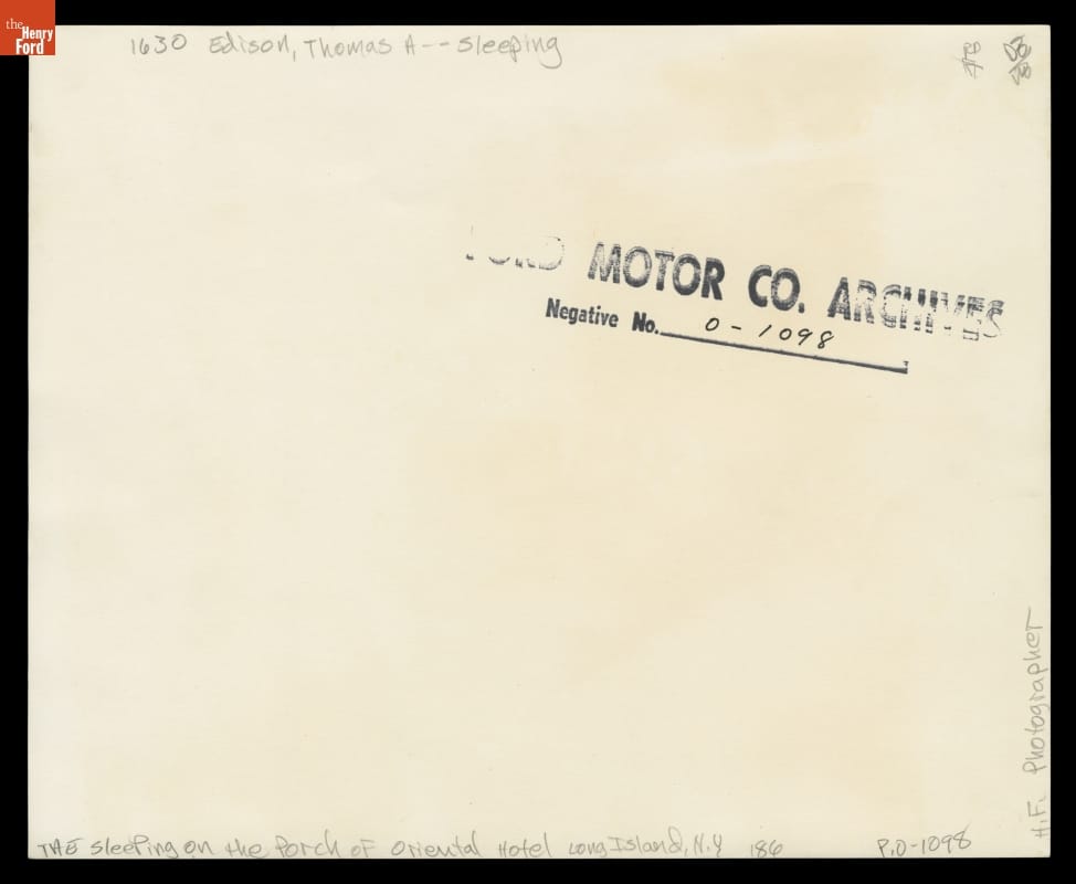 Thomas Edison Asleep at the Oriental Hotel, Manhattan Beach, Snapshot by Henry Ford, 1896