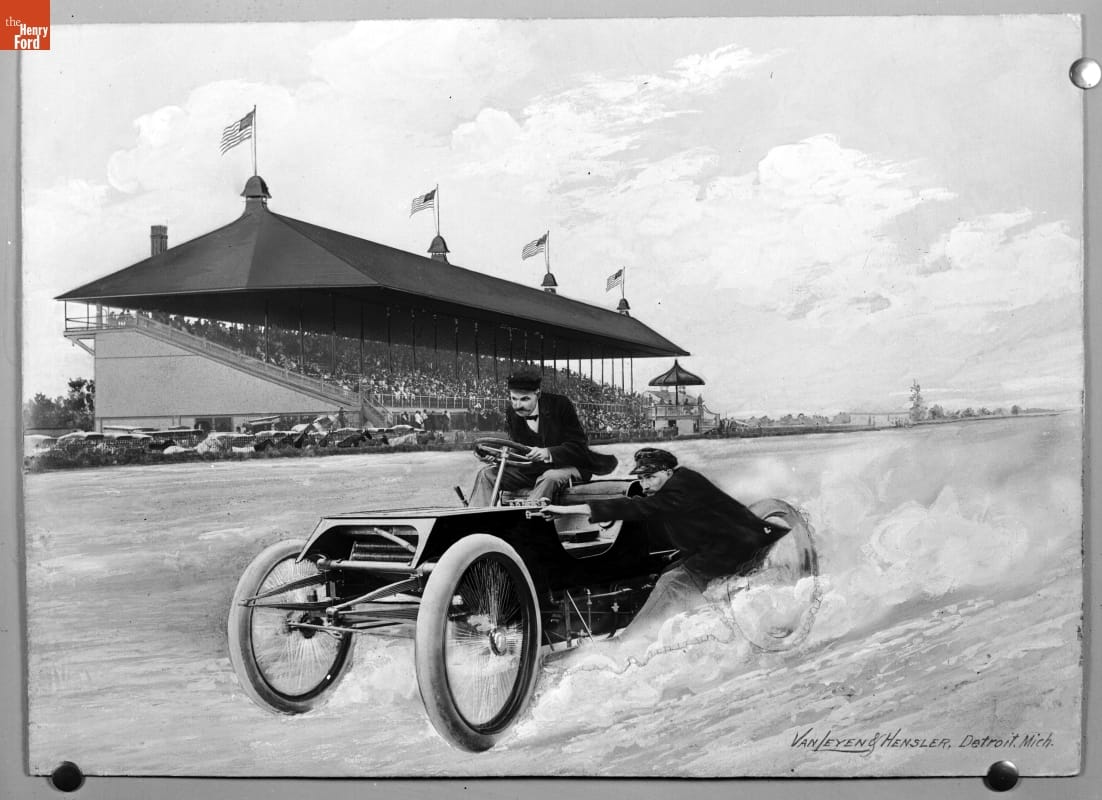 Composite photographic print of Henry Ford (driver) and Ed "Spider" Huff, riding mechanic, (riding the sideboard) driving Sweepstakes, Ford's first race car, to victory at the Grosse Pointe Race Track, Grosse Point, Michigan, October 10, 1901. Originally produced by VanLeyen and Hensler Photographic Company of Detroit, this 1953 reprint is composed of two separate images; the race track grandstands and track and a posed photo of Henry Ford and Ed Huff. The composite image celebrates Henry Ford's first racing victory over Alexander Winton, then the most well-known auto maker in the United States.