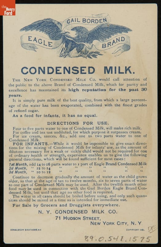 Feeding infants tainted cow's milk was a common cause of infant mortality. In 1856, Gail Borden introduced Eagle Brand Condensed Milk to combat this. This product became so popular for soldiers during the Civil War that, by the end of the war, it had gained a reputation for being safe, wholesome, and nourishing -- a trusted food for infants.
