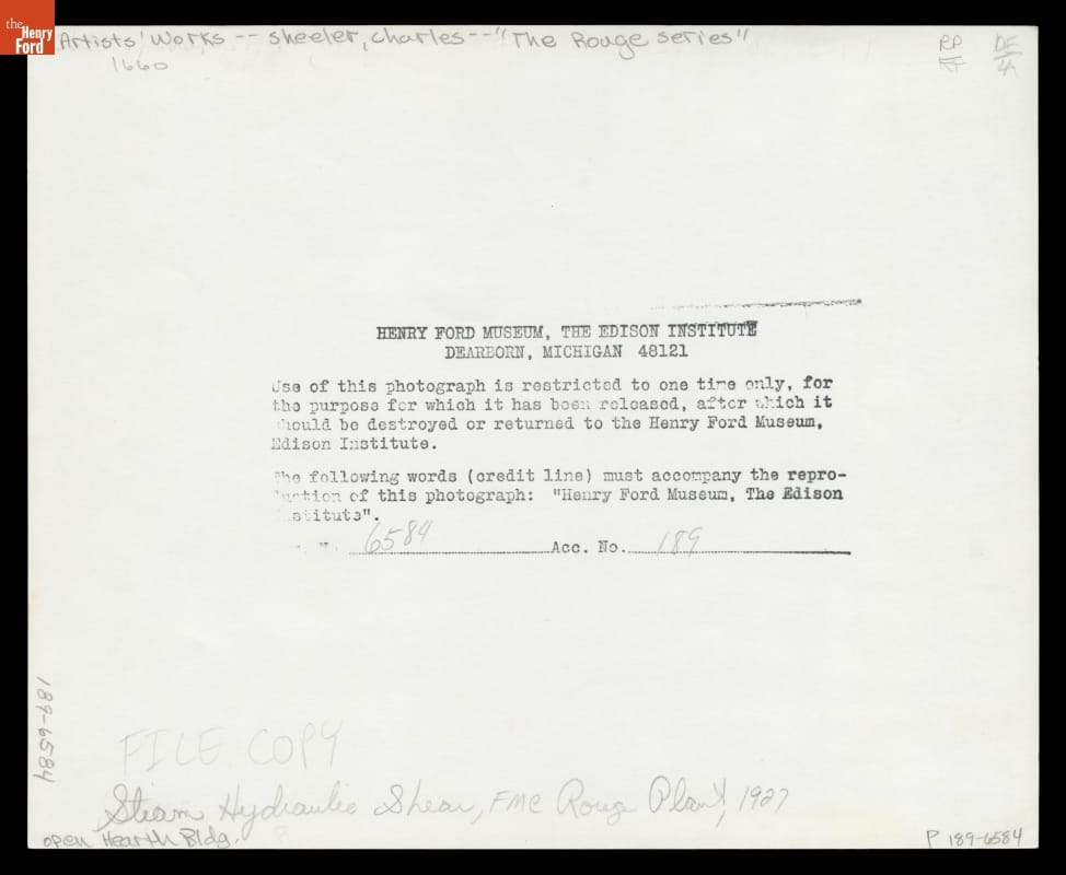 Sheeler took more than thirty-two photographs. Of the prints he developed, one group went to Ford Motor Company. Of these, only twelve 8 x 10 inch copy negatives were made by the company in 1929 from the original photographs. The company used these images for the covers of their magazine, Ford News between 1929 and 1930. Today, these 1929 contact prints are part of the collections of The Henry Ford.