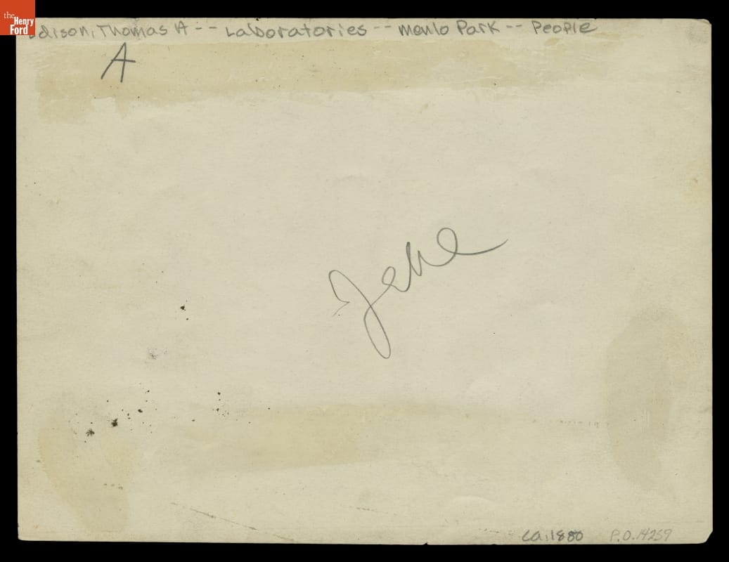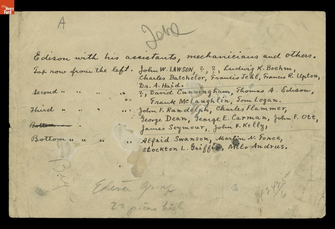 Edison with his assistants, mechanicians and others. Top row from the left: John W. Lawson, [?], [?], Ludwig K. Boehm, Charles Batchelor, Francis Jehl, Francis R. Upton, Dr. A. Haid. Second row: [?], David Cunningham, Thomas A. Edison, Frank McLaughlin, Tom Logan. Third row: John R. Randolph, Charles Flammer, George Dean, George E. Carman, John F. Ott, James Seymour, John F. Kelly, Bottom row: Alfrid Swanson, Martin N. Force, Stockton L. Griffin, Milo Andrus.