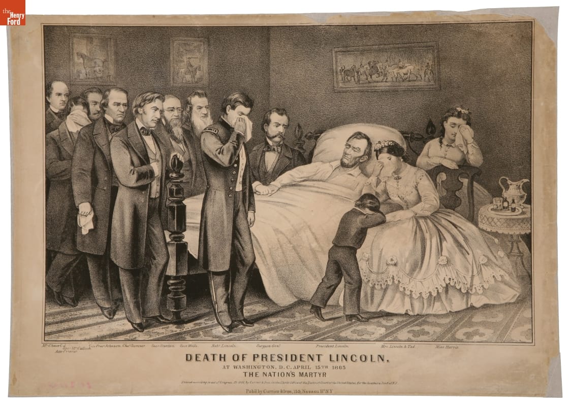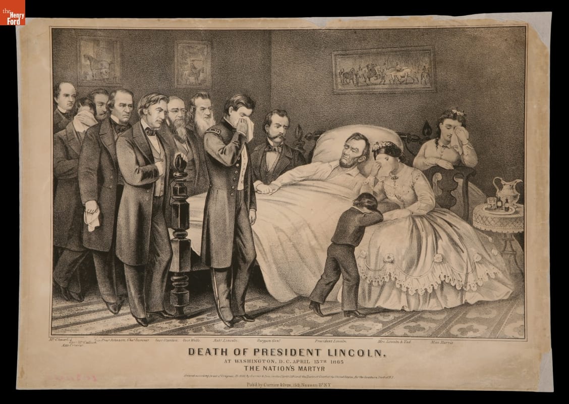 This lithograph print shows a representation of the tragic event of Abraham Lincoln's death. It occurred in a room of the Petersen House, a boardinghouse across the street from Ford's Theater in Washington, D.C., where the president had been shot. The group of people shown gathered at the president's deathbed includes Mrs. Lincoln, their two sons, the vice president, cabinet members, the Supreme Court chief justice, a senator, and the surgeon general. Not all of these people were actually in the room the morning Lincoln died. But sentiment about Lincoln sold well. So, the people were changed to appeal to popular taste.