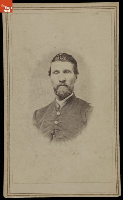 Soldiers finishing their service in the Civil War often had their photographic portraits made to mark the occasion. This carte-de-visite bust portrait of an unidentified Union Army soldier was photographed at A.A. Barnes' Picture Palace in Indianapolis, Indiana, following the end of the Civil War. It has a green 3-cent tax revenue stamp on the back date stamped May 15, 1865.