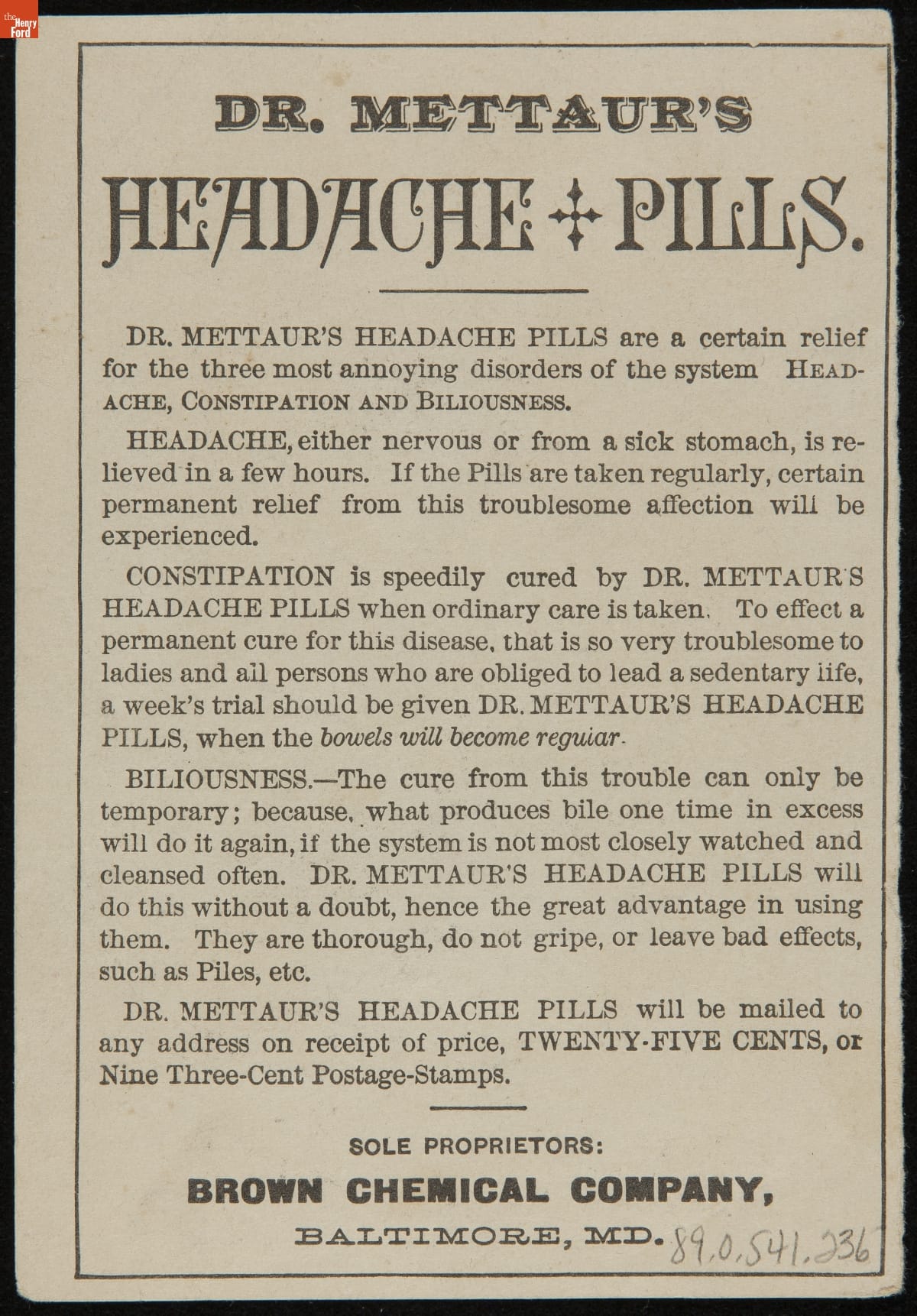 Trade Card for Dr. Mettaur's Headache Pills, Brown Chemical Co., 1880-1900
