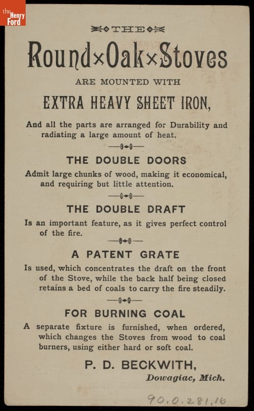 Trade Card for Round Oak Stoves, P. D. Beckwith, 1880-1889