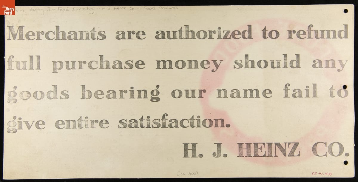 Merchants are authorized to refund / full purchase money should any / goods bearing our name fail to / give entire satisfaction. / H. J. Heinz Co.