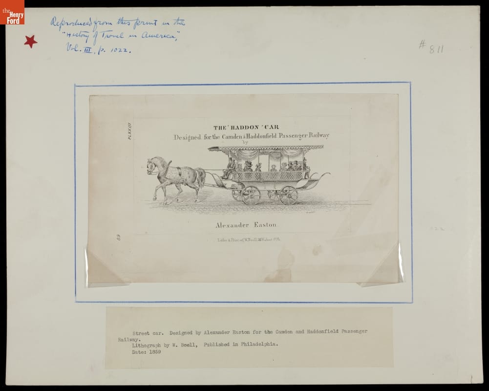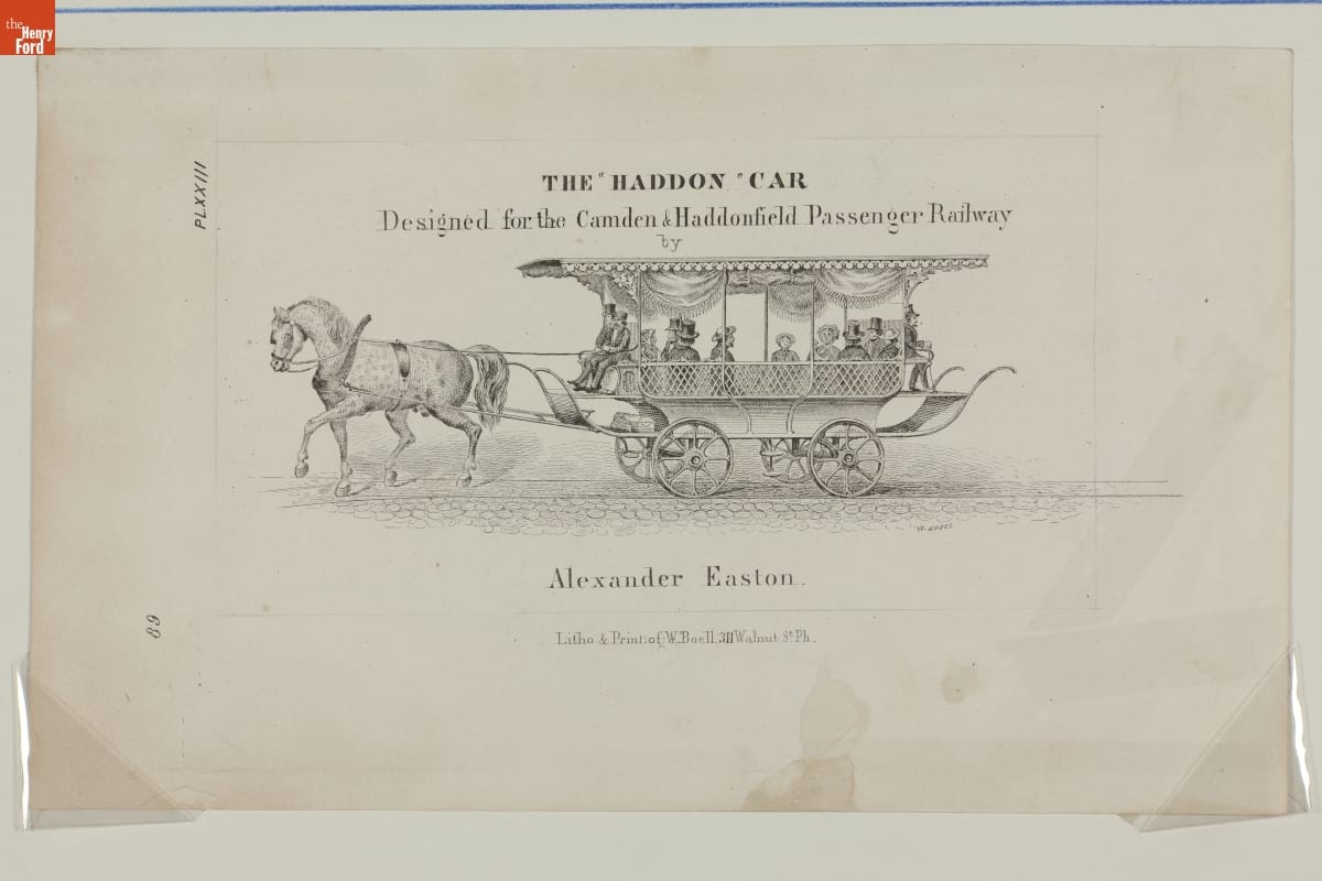 Horse-drawn streetcars provided a convenient and affordable way to get around a growing city. These streetcars traveled the main urban thoroughfares and took passengers to their workplaces, local shops and businesses, parks and other destinations. Alexander Easton designed the "Haddon Car" for the Camden Haddonfield Passenger Railway in New Jersey. He later helped organize the Toronto (Canada) Street Railway in 1861.