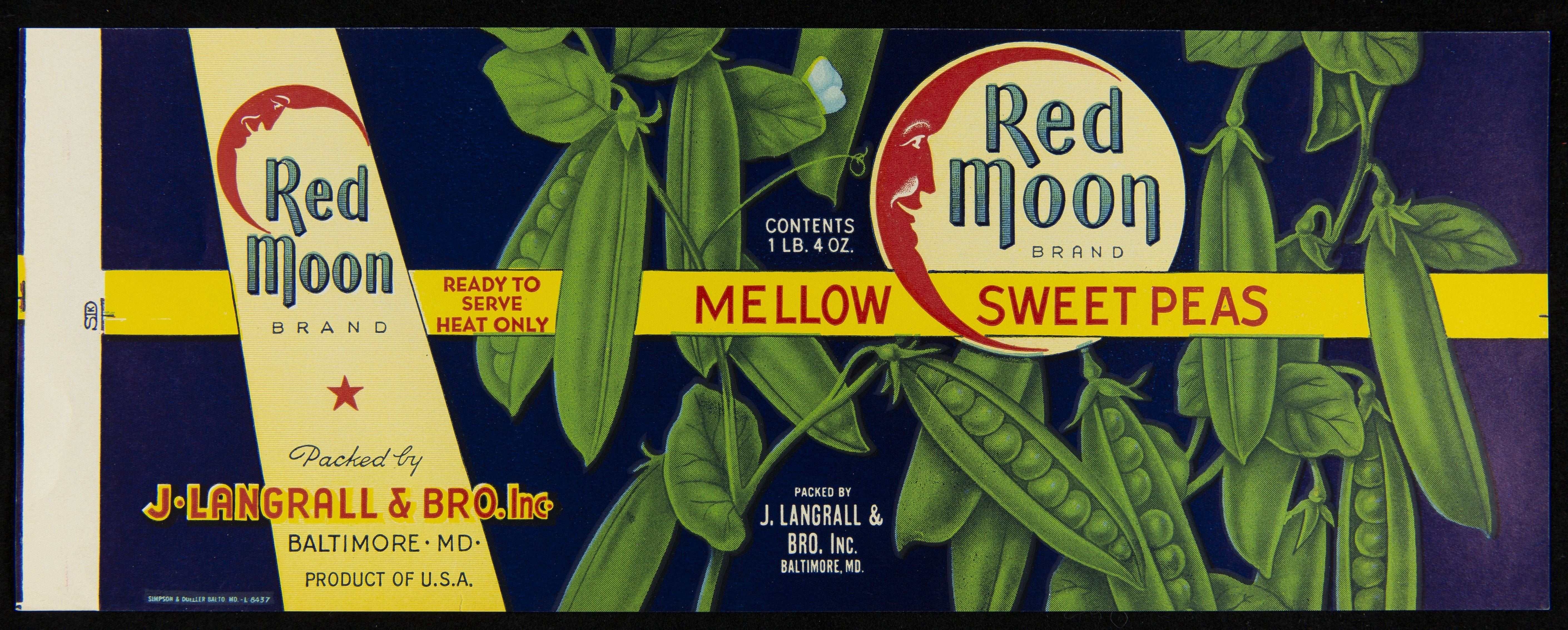Red Moon / Packed By / J. Langrall & Bro. Inc. / Baltimore, MD / Simpson & Doeller, Balt, MD - L. 8437 / Ready to / Serve / Heat Only / Mellow / Sweet Peas