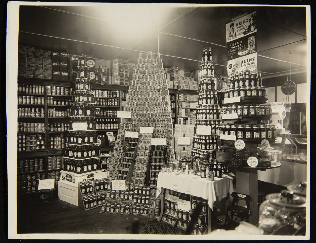 Heinz developed a strong corporate image and aggressively kept the company name and trademark in front of the public. The company's sales force was trained to draw attention to the product line through in-store promotions and consumer taste tests. This photograph shows an elaborate display and a table stocked with a number of Heinz products for customers to try.