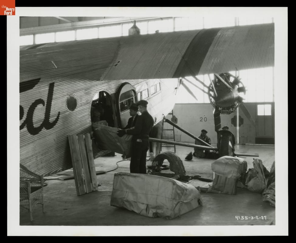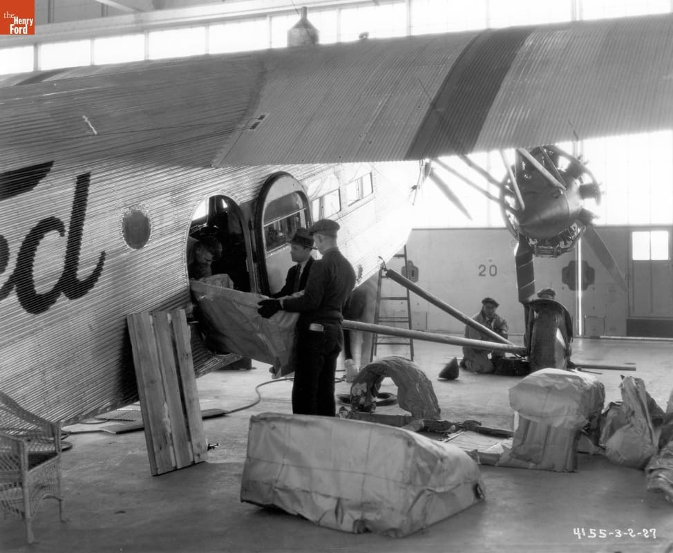 Model 4-AT airliners were designed and built by the Stout Metal Airplane Company, a division of Ford Motor Company. These rugged planes earned a reputation for being safe and dependable. From the late 1920s into the 1930s, they were the backbone of the scheduled airline industry. They could carry either passengers or freight. Here, employees removed a wicker passenger seat, left, to load automotive parts.