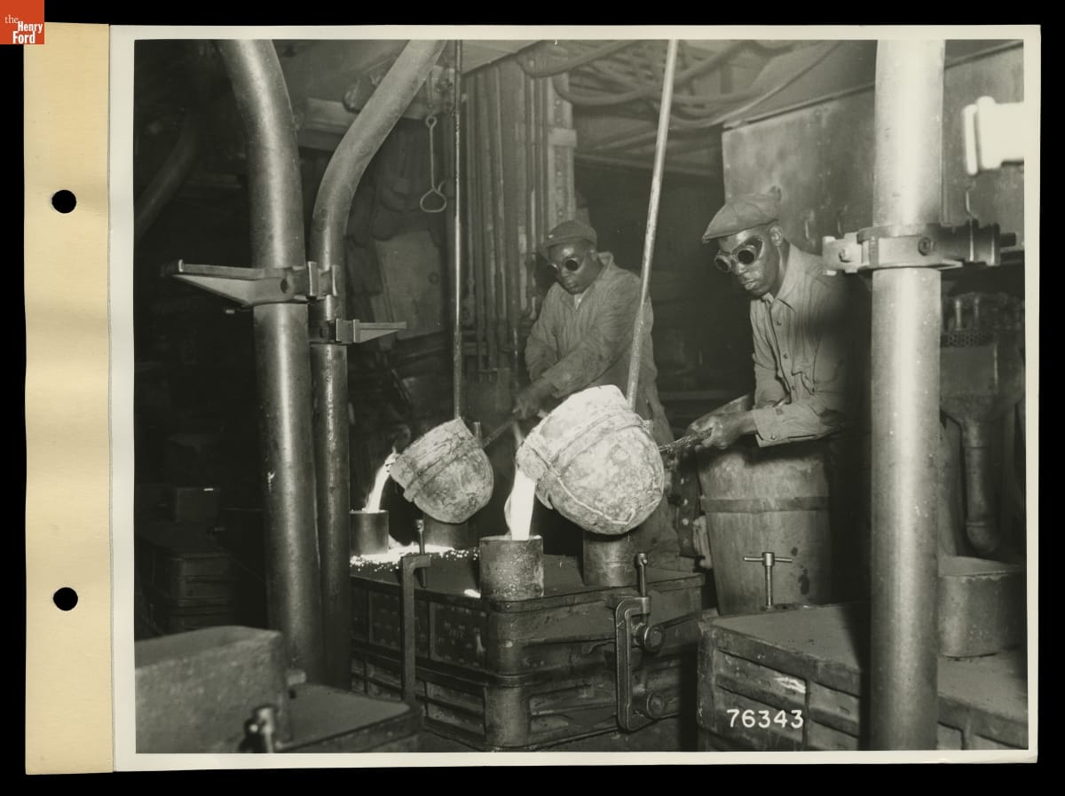 Workers at the Ford Rouge plant's foundry poured a molten mixture of metal, coke, and limestone into molds to create cast-metal engine blocks and parts. Once "shaken out" of their molds, castings were roughly machined before heading elsewhere for finishing and assembly. The Rouge foundry set an industry benchmark in 1932 by successfully casting Ford's intricate, single-piece V-8 engine block.