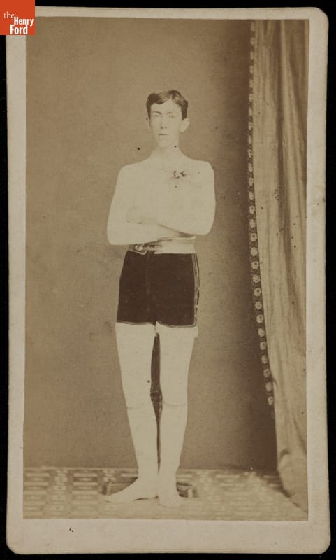 This man, identified as W. E. Drew, was a fireman with the Alert Hose Company of Big Rapids, Michigan. To 21st-century eyes his uniform may appear odd, but it was worn during firemen's tournaments and not for fighting fires. These competitions pitted rival firefighting companies against each other in engine and hose races and other tests of firefighting skills needed during fire emergencies.