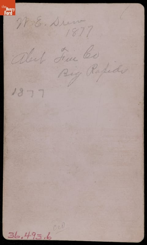 Handwritten in pencil on back of image: W.E. Drew / 1877 / Alert Fire Co / Big Rapids / 1877