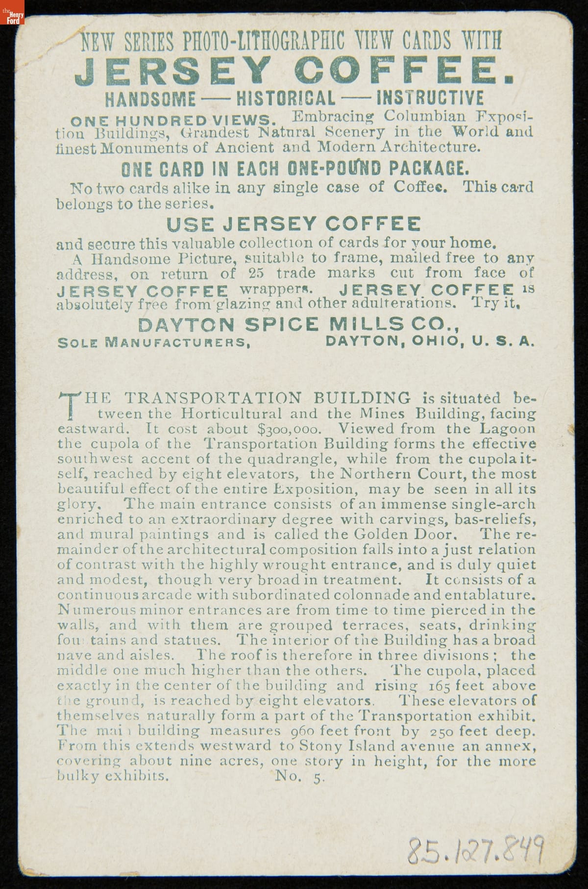 Trade Card for Jersey Coffee, "Transportation Building, Columbian Exposition 1893," Dayton Spice Mills Co., 1890-1895