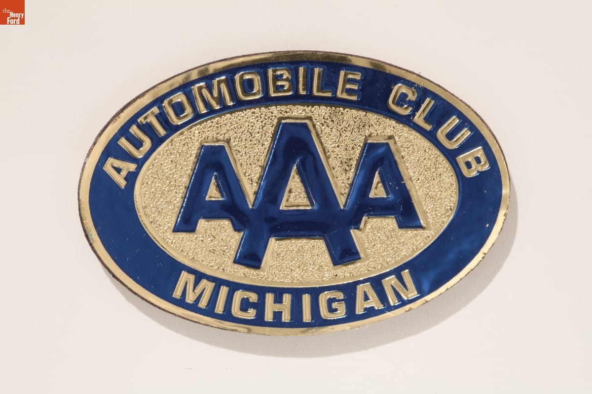 Twentieth-century motorists who belonged to automobile clubs attached badges or emblems to their vehicles. These membership badges were displayed prominently on radiators, license plates, bumpers, or elsewhere on the car. The badges helped identify members and promoted the organization. The Automobile Club of Michigan, a local AAA affiliate, issued badges, liked this one, in the 1950s and 1960s.