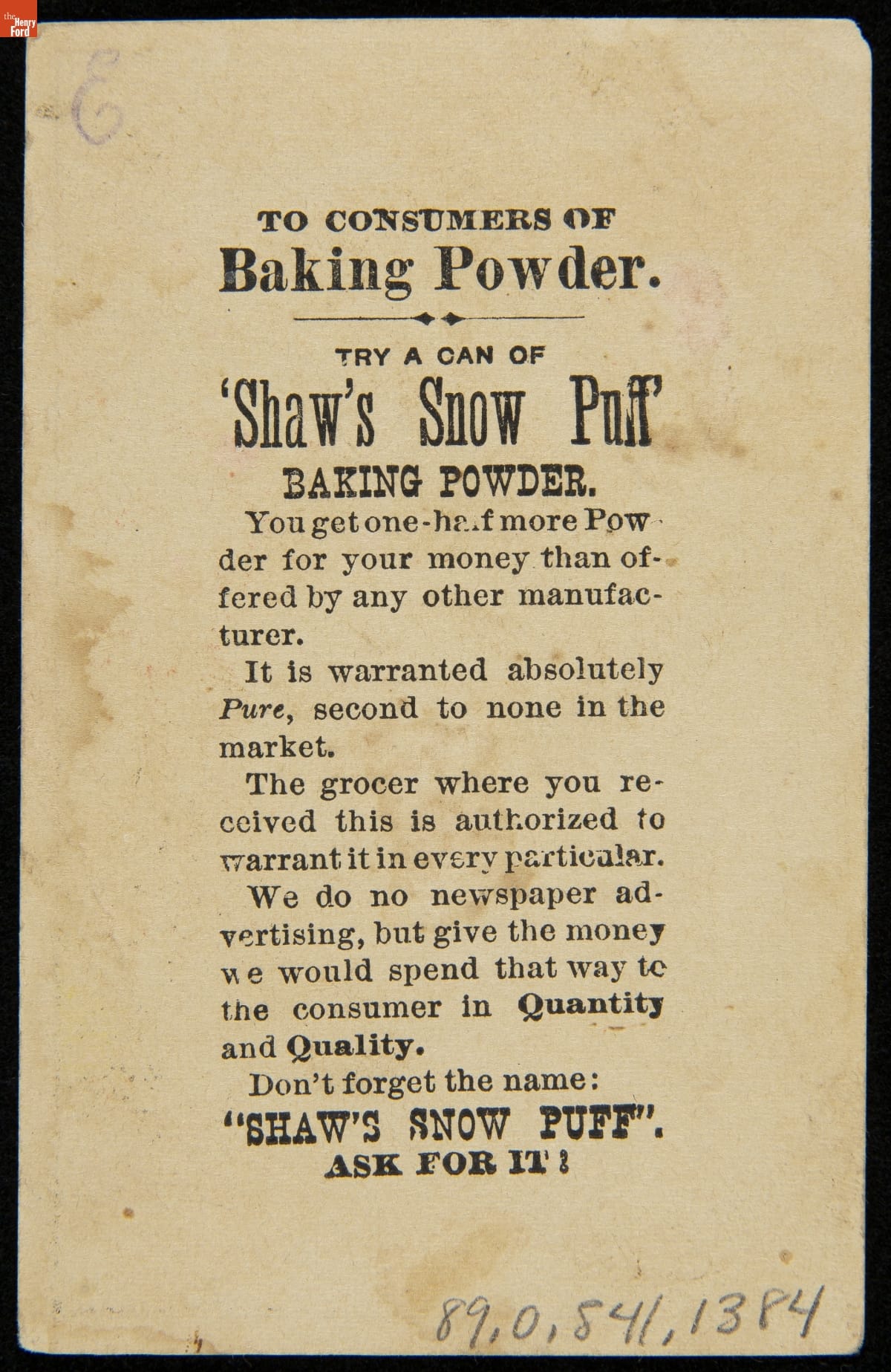 Trade Card for Shaw's Snow Puff Baking Powder, 1880-1900