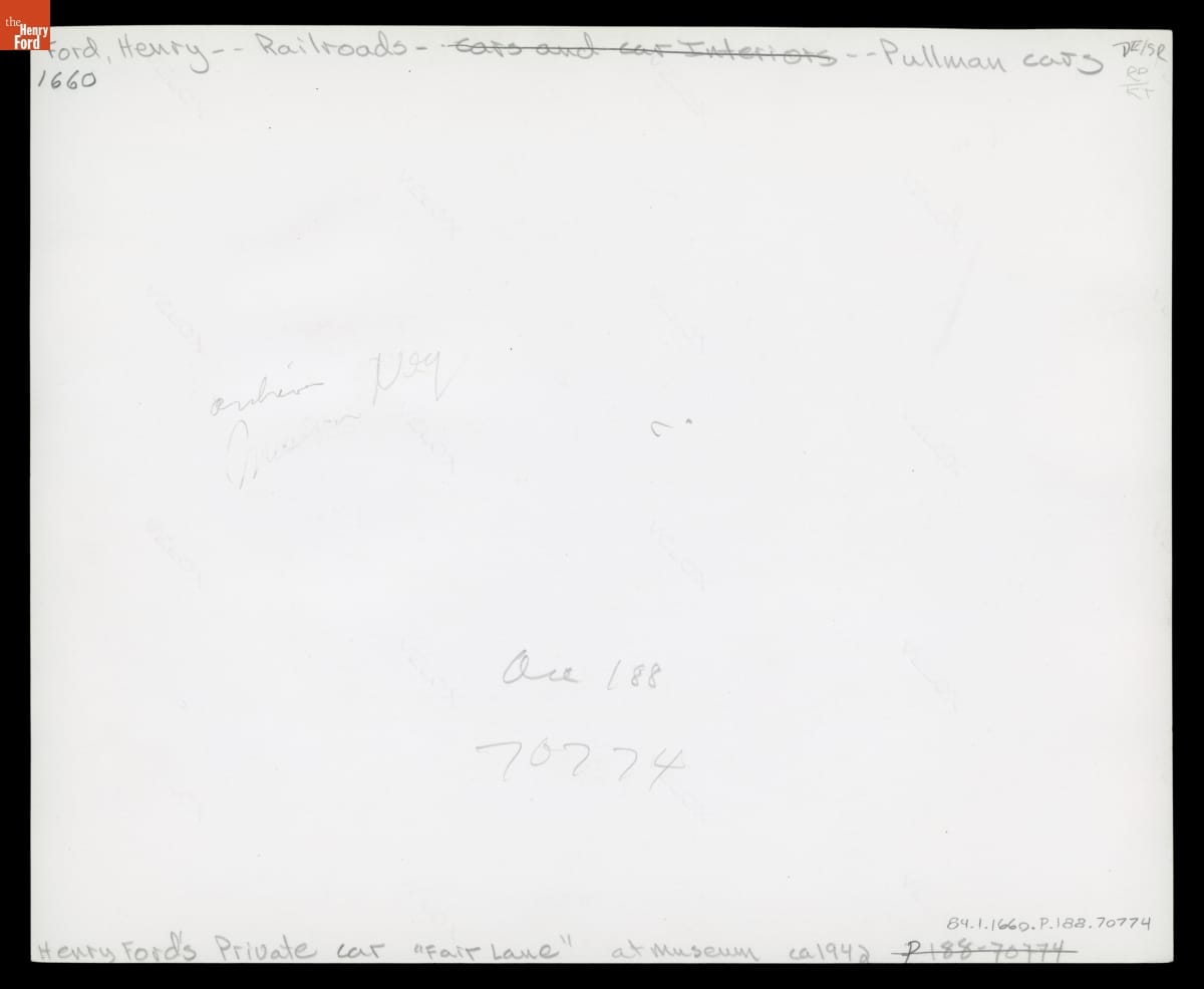 By 1920, Henry and Clara Ford found it increasingly difficult to travel with any degree of privacy. They purchased a private railcar and named it Fair Lane. The car had four private rooms, an observation lounge, a dining room, and a fully equipped kitchen. It could accommodate eight passengers. The couple made over 400 trips using Fair Lane before selling the passenger car in 1942.