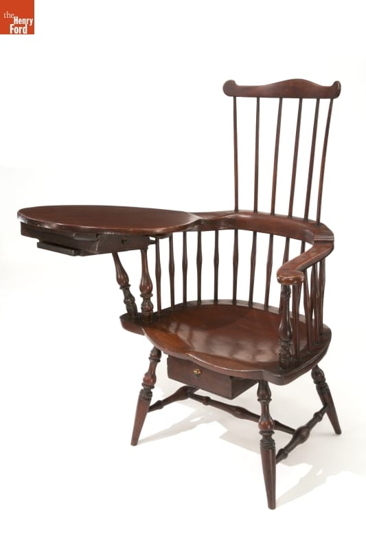 Instead of a set of office furniture, Reverend Erastus Learnerd of Westminster, Connecticut, used this Windsor writing armchair to draft his sermons and correspondence. The drawer beneath the tablet, or writing pad, and another under the seat could hold writing supplies. A sliding shelf, also under the tablet, supported a candlestick for writing after dark.