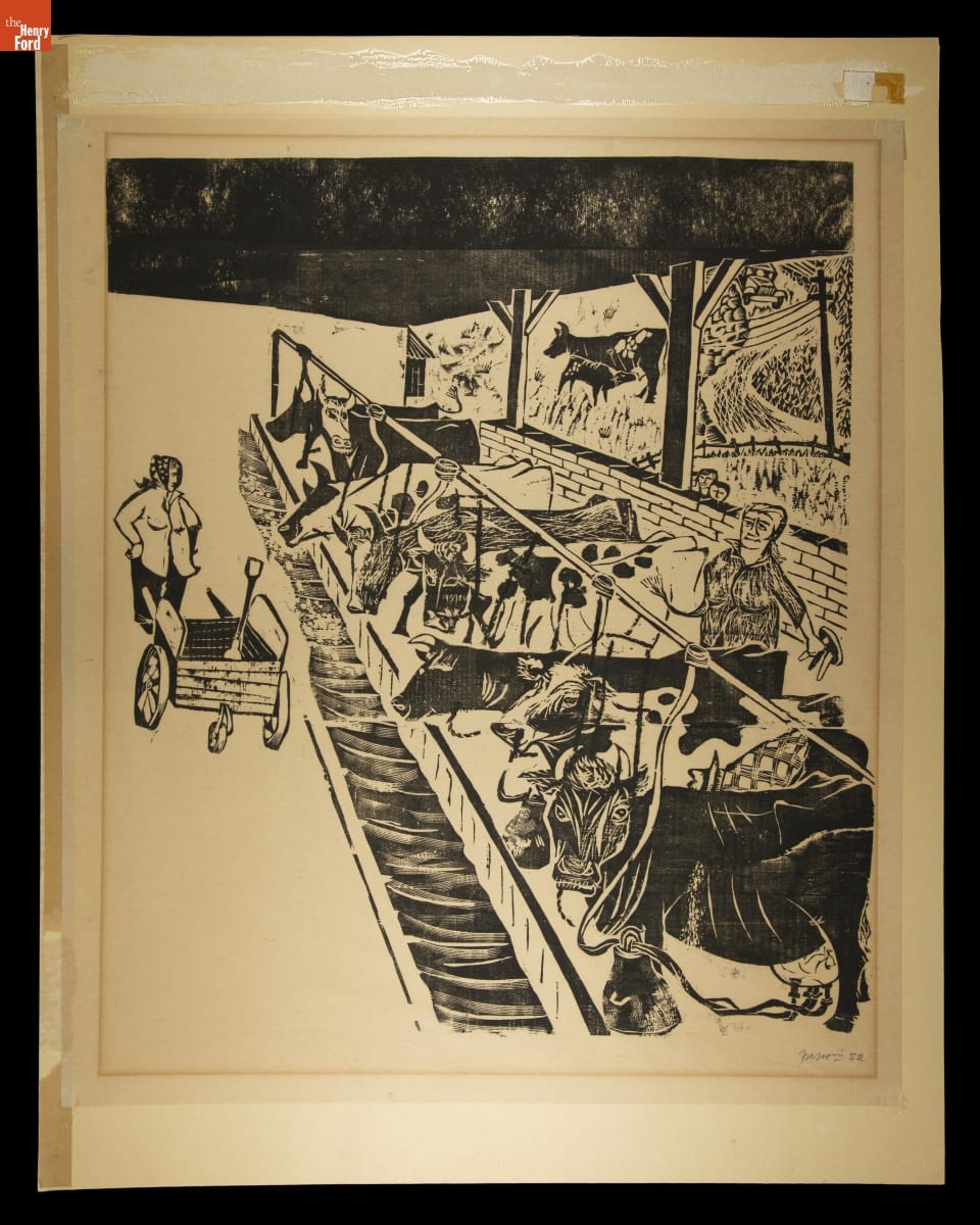 Linocut, "Woman Milking Cows," 1952