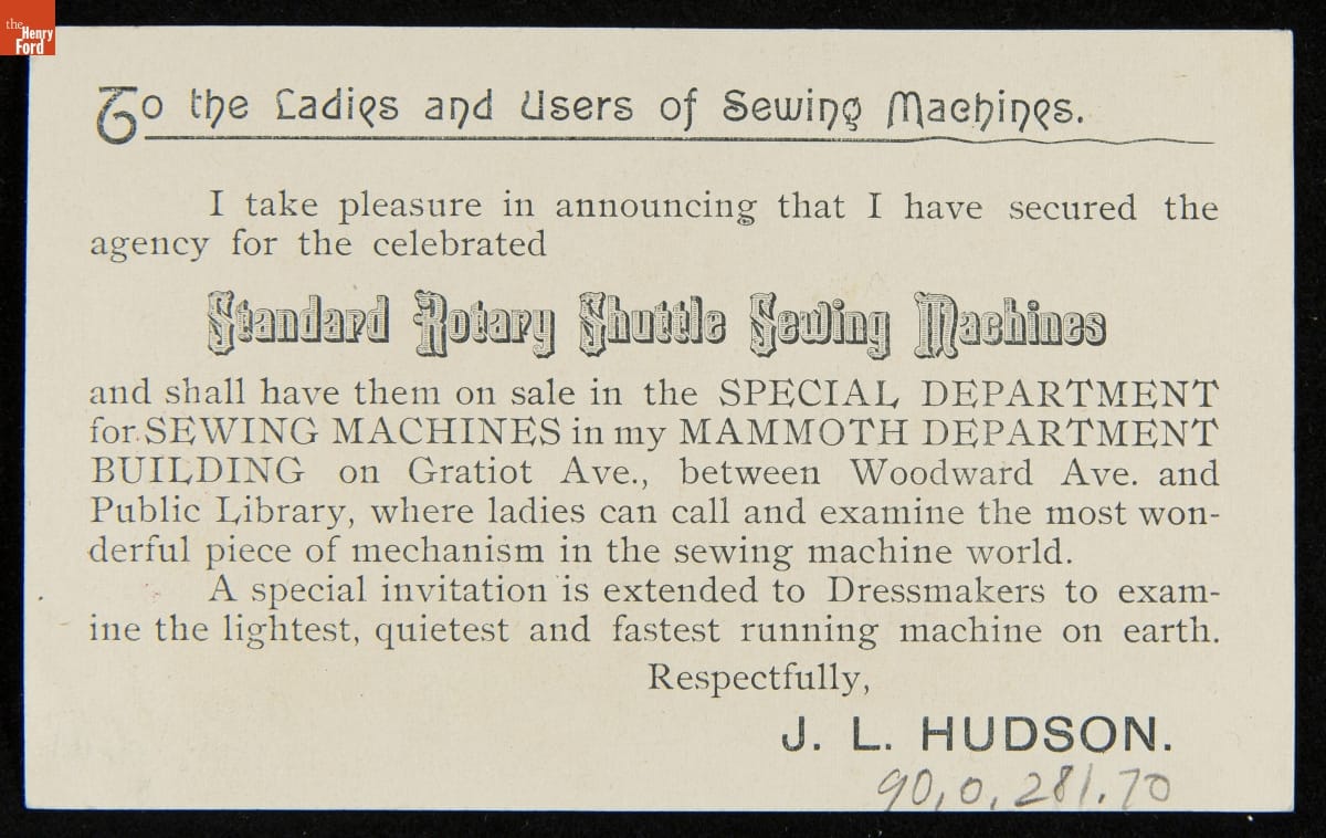 As color printing gained momentum in the late 19th century, trade cards became a major means of advertising goods and services. Americans enjoyed and often saved the little advertisements found in product packages or distributed by local merchants. This trade card advertises the Standard Sewing Machine Company.
