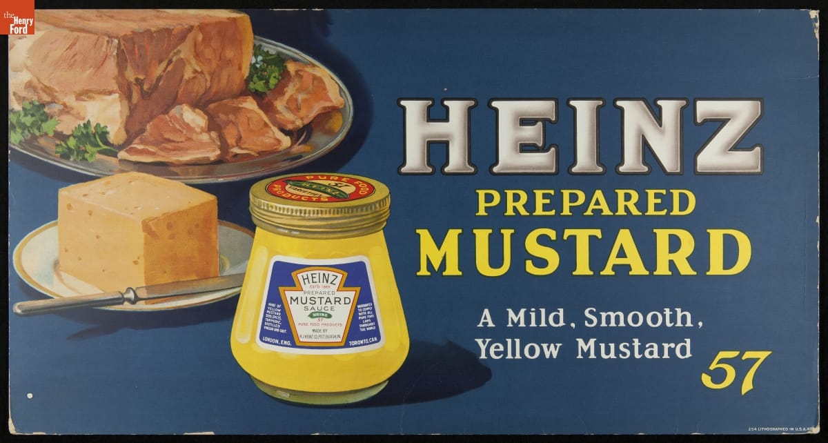 Henry J. Heinz rarely missed an opportunity to market his "57 Varieties" -- a catchy slogan he created despite offering a line of more than 60 packaged food products. A prolific promoter, Heinz aimed to reach consumers in stores, at home, and everywhere in-between. This colorful poster advertised Heinz Prepared Mustard to passengers riding a streetcar.