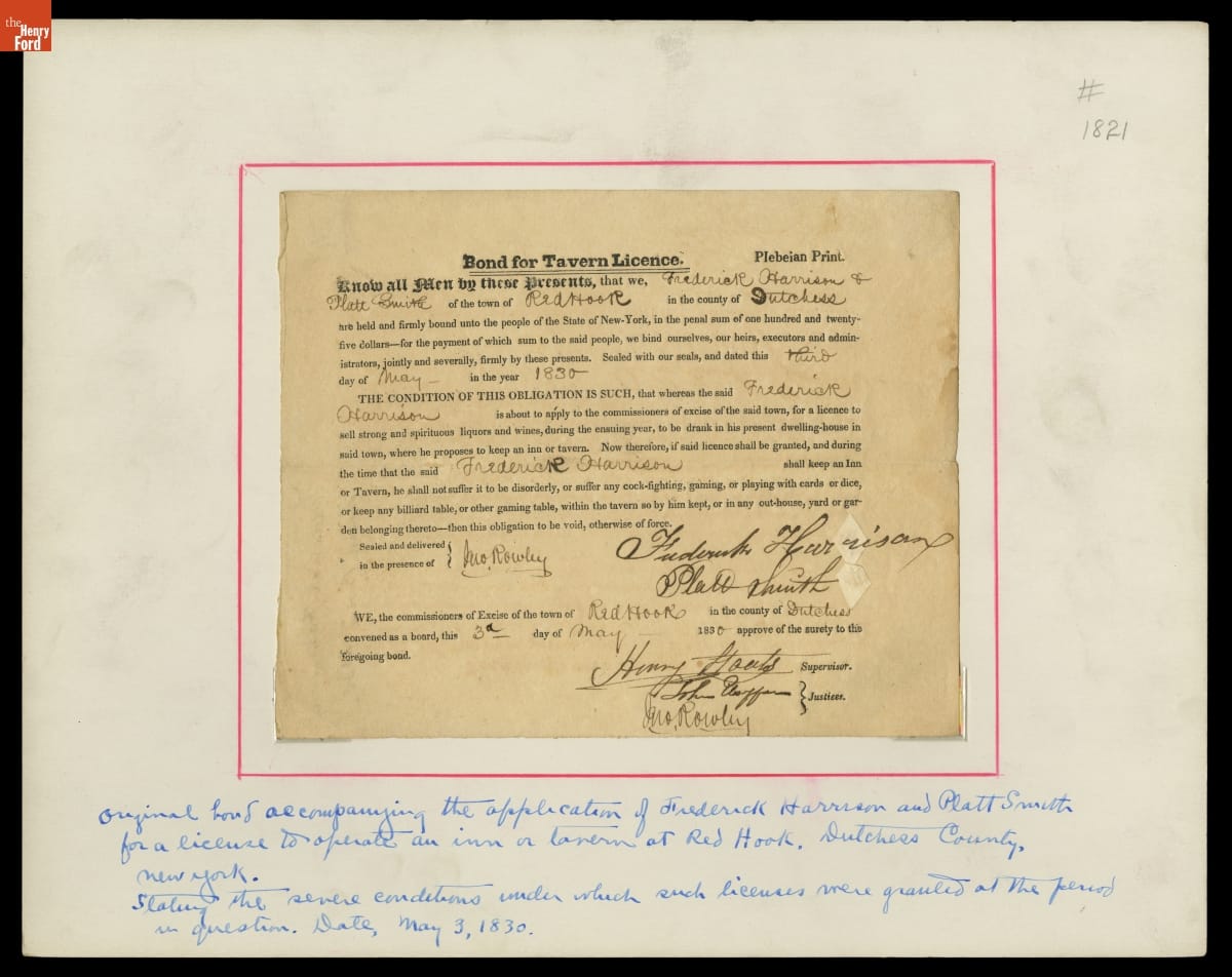 Frederick Harrison secured this bond to sell "strong and spiritous liquors and wines" at his tavern located in Red Hook, New York, in 1830. Government officials required Harrison to maintain an orderly tavern -- no cockfighting, gaming, card or dice playing, or keeping a billiards table was allowed. Failure to comply would void the bond.