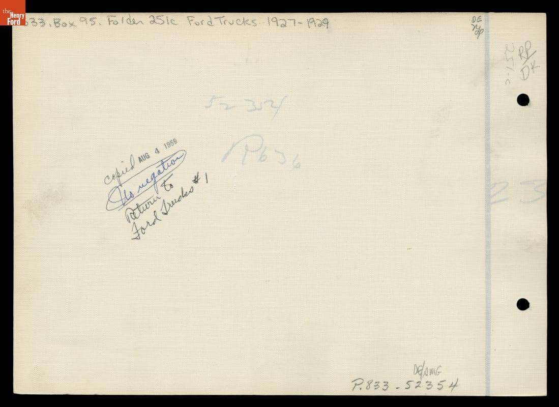 Front: 52354 | 11-22-28 On vehicle: 1-249-781 | MICH. COMMERCIAL | Ford | [Wm.] DARKWOOD CO. Back: copied AUG 4 1959 | No negative | Return to | Ford Trucks #1