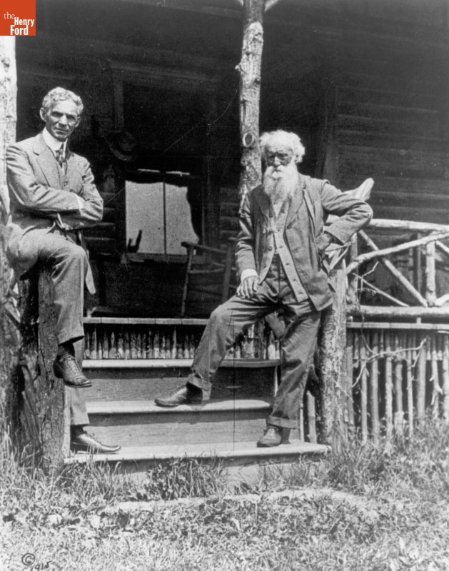 Perhaps a seemingly odd pair, automobile magnate Henry Ford and naturalist John Burroughs shared a love of nature. Here, the two friends pose in front of Woodchuck Lodge near Burroughs' birthplace in the Western Catskills of New York. Ford had helped him purchase the property outright in 1913. Burroughs summered here, writing and entertaining guests at Woodchuck Lodge.