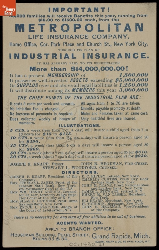 Advertised service by Metropolitan Life Insurance Company, Home Office in New York, New York; branch office in Grand Rapids, Michigan. Card lithographaphed by Major & Knapp Co.