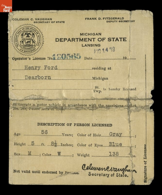 This copy of Henry Ford's driver's license allows us to have a better sense of his physical presence. Information on driver's licenses hasn't changed much in the past century.