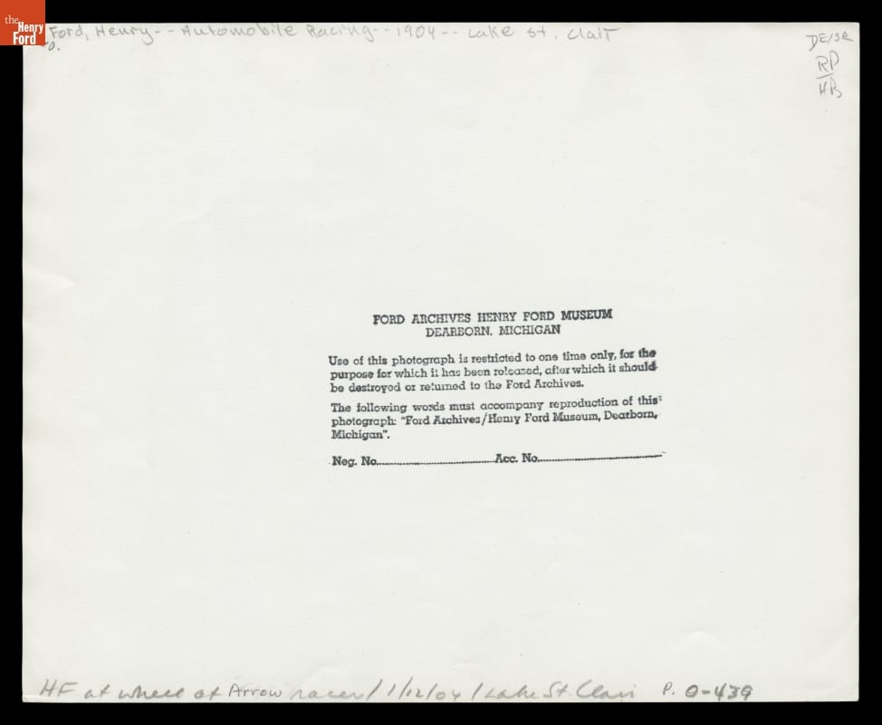 Henry Ford at the Wheel of the Arrow Racer, Lake St. Clair, Michigan, 1904
