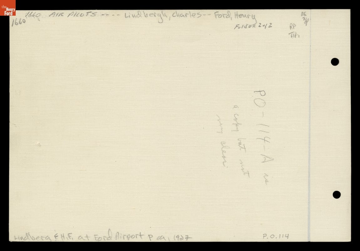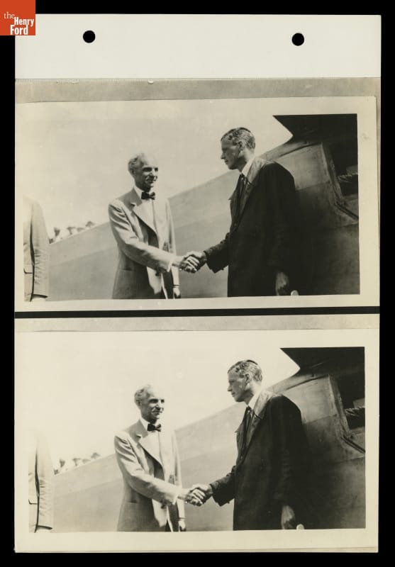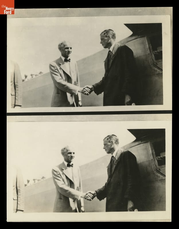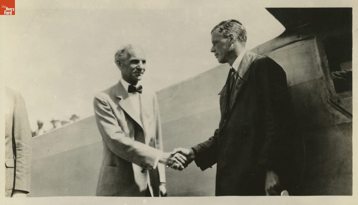 Henry Ford and Charles Lindbergh shook hands during Lindbergh's August 10-12, 1927, visit to the Michigan cities of Dearborn and Detroit. The stop was part of a national tour during which Lindbergh flew the Spirit of St. Louis to every one of the 48 states in the Union at that time.