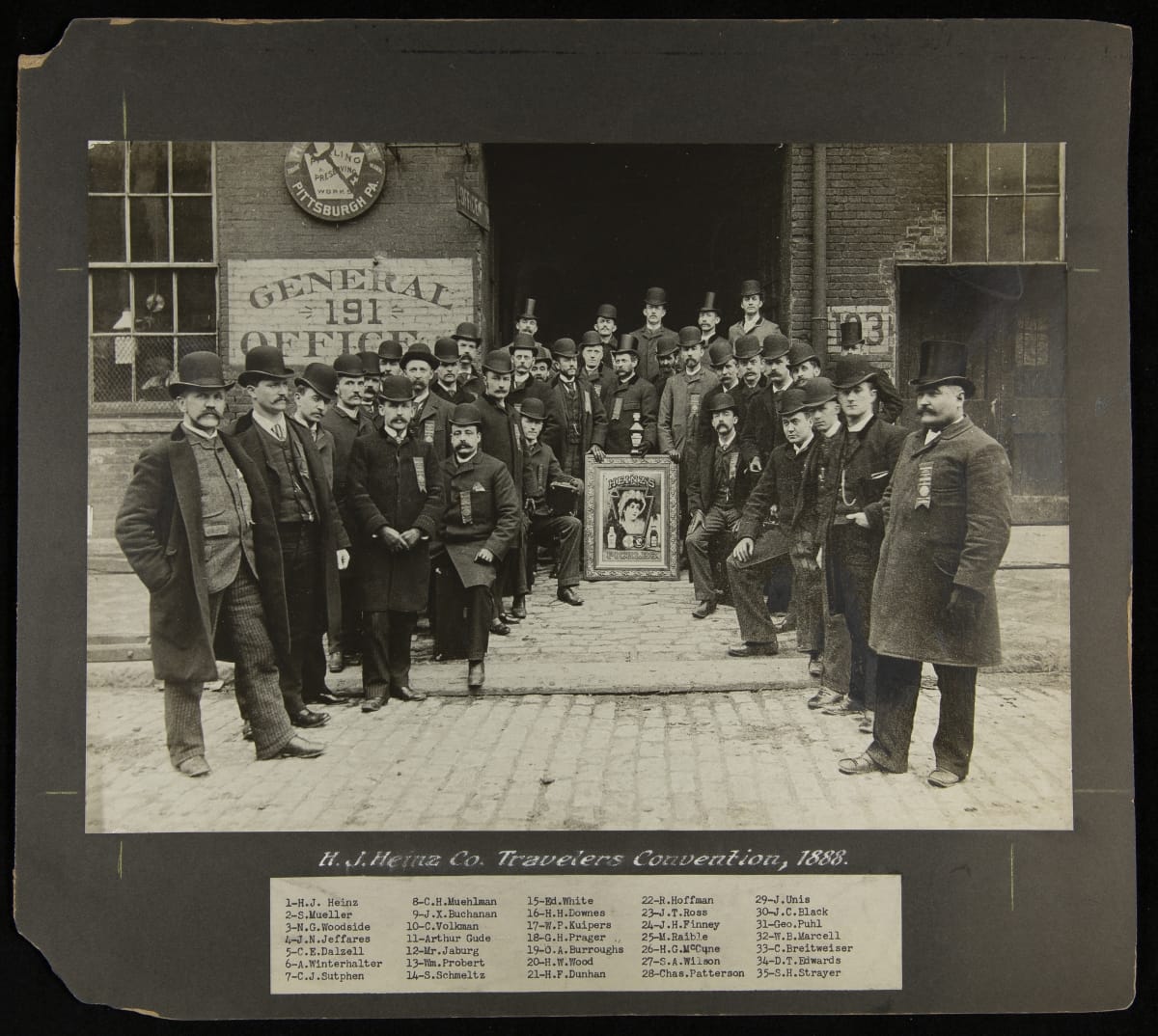 H. J. Heinz Co. Travelers Convention, 1888. / 1 - H. J. Heinz, 2 - S. Mueller, 3 - N. G. Woodside, 4 - J. N. Jeffares, 5 - C. E. Dalzell, 6 - A. Winterhalter, 7 - C. J. Sutphen, 8 - C. H. Muehlman, 9 - J. X. Buchanan, 10 - C. Volkman, 11 - Arthur Gude, 12 - Mr. Jaburg, 13 - Wm. Probert, 14 - S. Schmeltz, 15 - Ed. White, 16 - H. H. Downes, 17 - W. P. Kuipers, 18 - G. H. Prager, 19 - O. A. Burroughs, 20 - H. W. Wood, 21 - H. F. Dunhan, 22 - R. Hoffman, 23 - J. T. Ross, 24 - J. H. Finney, 25 - M. Raible, 26 - H. G. McCune, 27 - S. A. Wilson, 28 - Chas. Patterson, 29 - J. Unis, 30 - J. C. Black, 31 - Geo. Puhl, 32 - W. B. Marcell, 33 - C. Breitweiser, 34 - D. T. Edwards, 35 - S. H. Strayer