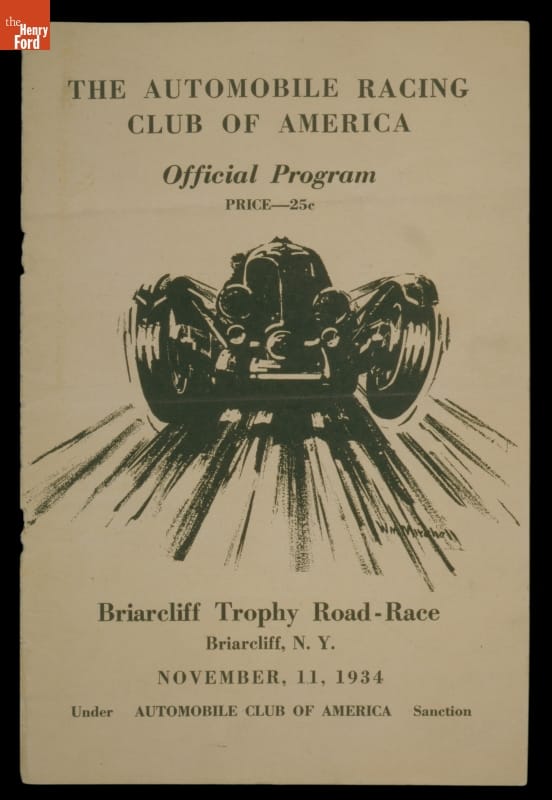 Bill Mitchell joined General Motors' Art and Colour Section in 1935 and served as GM's head of design from 1958 to 1977. His many successes included the 1938 Cadillac Sixty Special, the 1963 Buick Riviera, and the 1963 Chevrolet Corvette Sting Ray. Mitchell, a lifelong racing enthusiast, collected this program from a race held the year before he started at GM.