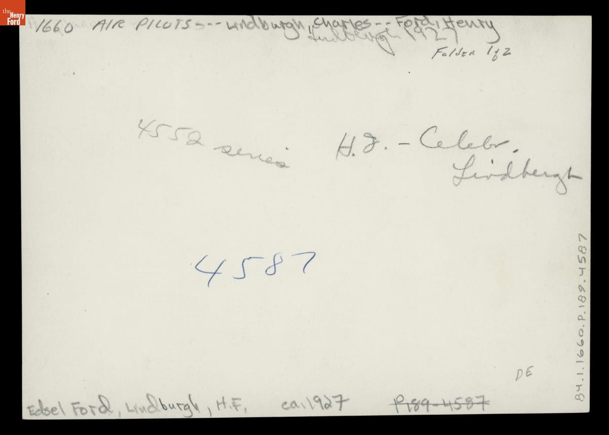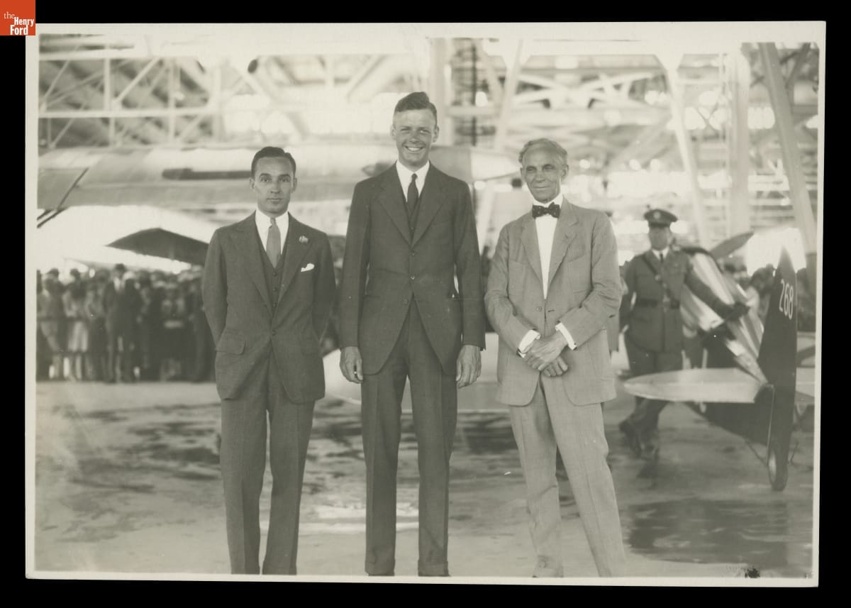 Following his pioneering solo transatlantic flight of May 20-21, 1927, Charles Lindbergh toured the United States with his airplane, the Spirit of St. Louis. He visited Detroit on August 10-12, 1927. While at Ford Airport in nearby Dearborn, Lindbergh posed for this photograph with Edsel Ford and Henry Ford.