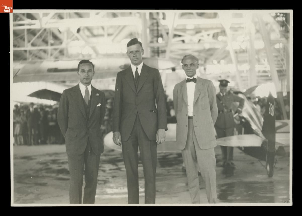 Following his pioneering solo transatlantic flight of May 20-21, 1927, Charles Lindbergh toured the United States with his airplane, the Spirit of St. Louis. He visited Detroit on August 10-12, 1927. While at Ford Airport in nearby Dearborn, Lindbergh posed for this photograph with Edsel Ford and Henry Ford.