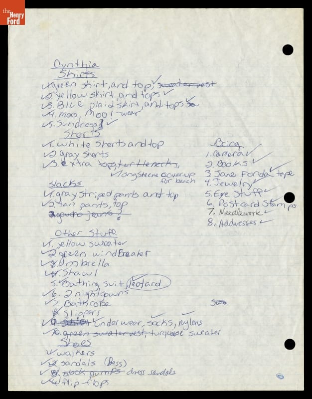 You are in your car, traveling down the highway, on the first day of vacation, and 300 miles from home. Did you pack everything? This vacationer prepared a list of clothes and other material her family needed to take along on their trip in 1986.