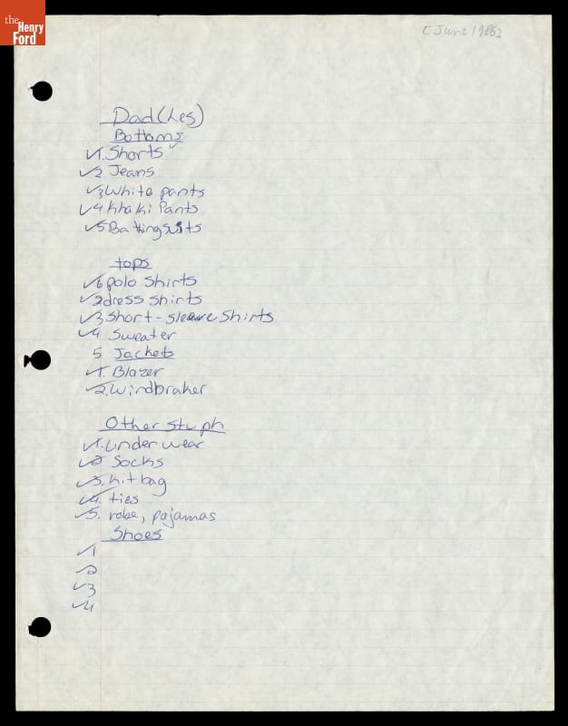 Handwritten Packing List for Family Vacation to Florida, June 1986