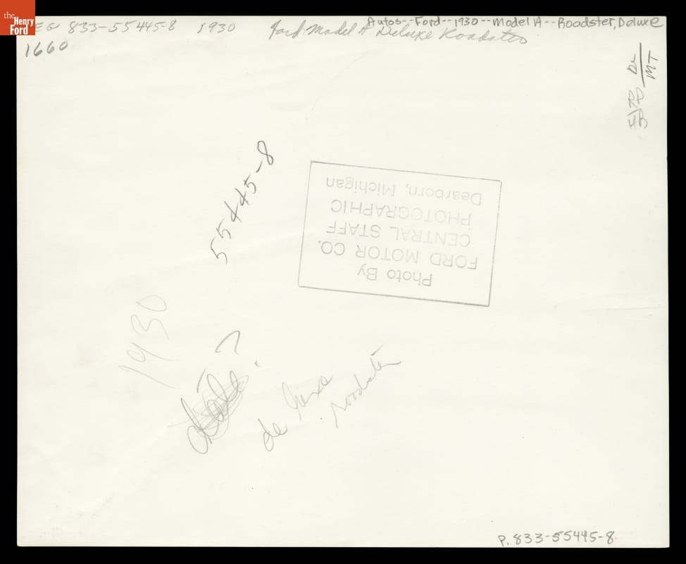 NEG 833-55445-8 1930 Ford Model A Deluxe Roadster | 833.55445-8 | Photo By | FORD MOTOR CO. CENTRAL STAFF | PHOTOGRAPHIC | Dearborn, Michigan | 1930 | de luxe | roadster