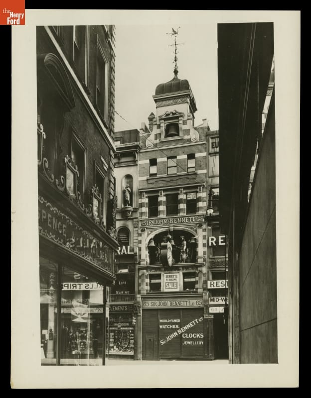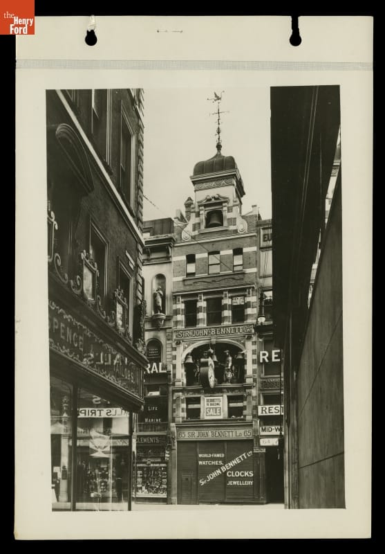 This photograph shows the Sir John Bennett Watch, Clock and Jewelry Store on its original site at 65 Cheapside, London. The image was taken in 1929, just before the structure was disassembled for shipment to Greenfield Village. Architect Edward L. Cutler reconfigured the structure from five stories to two, to better scale the building with others in the Village.