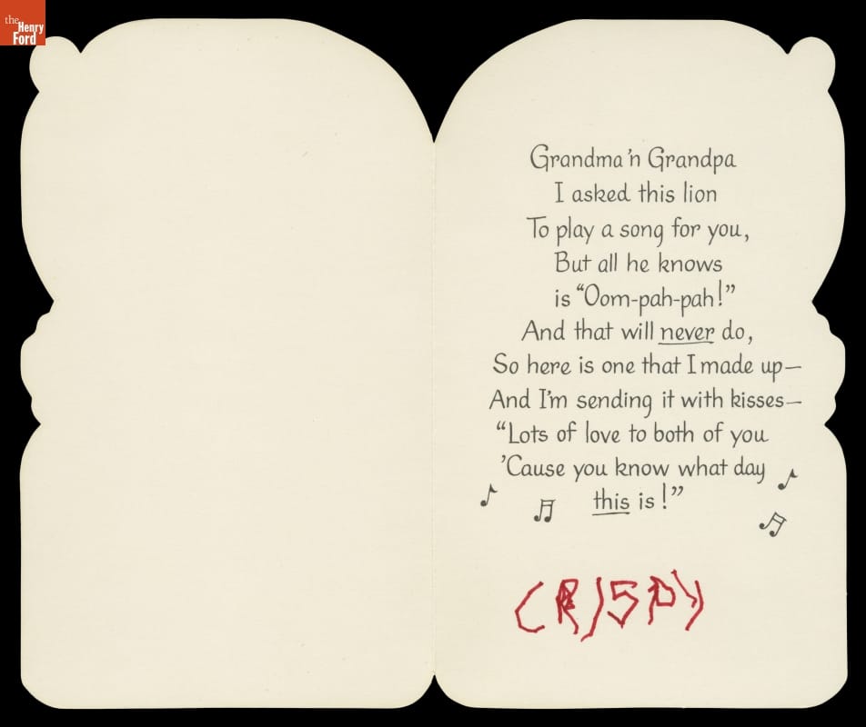 Grandma'n Grandpa | I asked this lion | To play a song for you, | But all he knows | is "Oom-pah-pah!" And that will never do, | So here is one that I made up- | and I'm sending it with kisses- | "Lots of love to both of you | 'Cause you know what day | this is!" | [signed] CRISPY