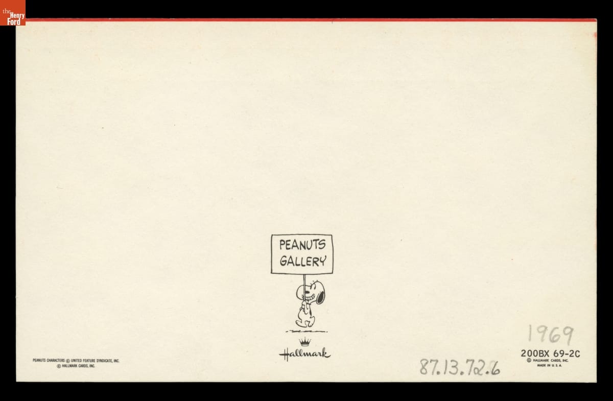 Christmas card manufactured by Hallmark Cards, Inc. based upon cartoon characters created by Charles Schultz and licensed to United Feature Syndicate.