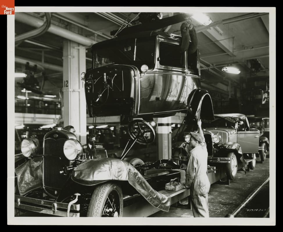 In the final stages of assembly, the body of a 1931 Ford Model A is lowered onto its chassis. Ford's assembly line resembled a river system. Smaller lines or "streams" fed components -- frames, engines, wheels, bodies -- to the larger final line. All the parts came together in this main "river" line where the car took shape in its completed form.