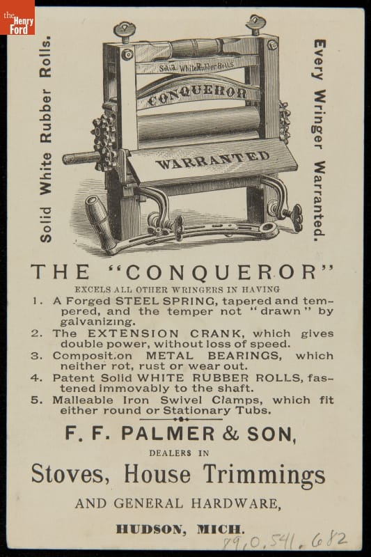 Advertised products made by Conqueror Wringer Co. in New York, New York. Retailed by F.F. Palmer & Son in Hudson, Michigan. Card lithographed by Donaldson Brothers, Five Points, New York