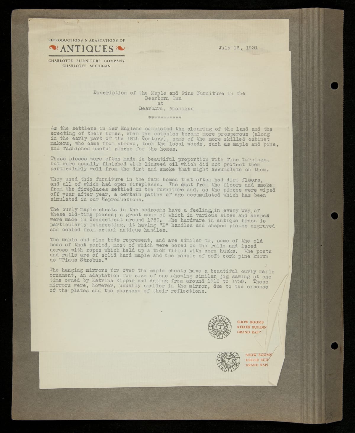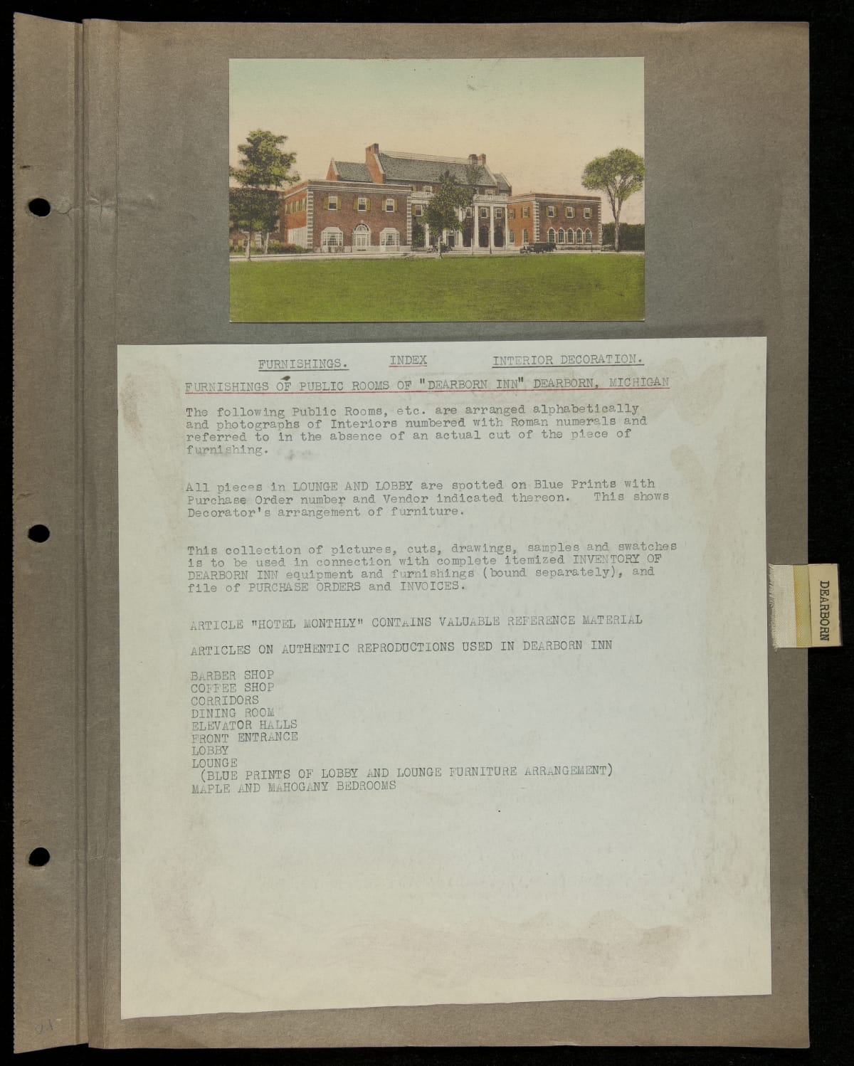 THF229295 / Scrapbook Documenting the Furnishing of Dearborn Inn, Dearborn, Michigan, 1931 / loose brochure 1