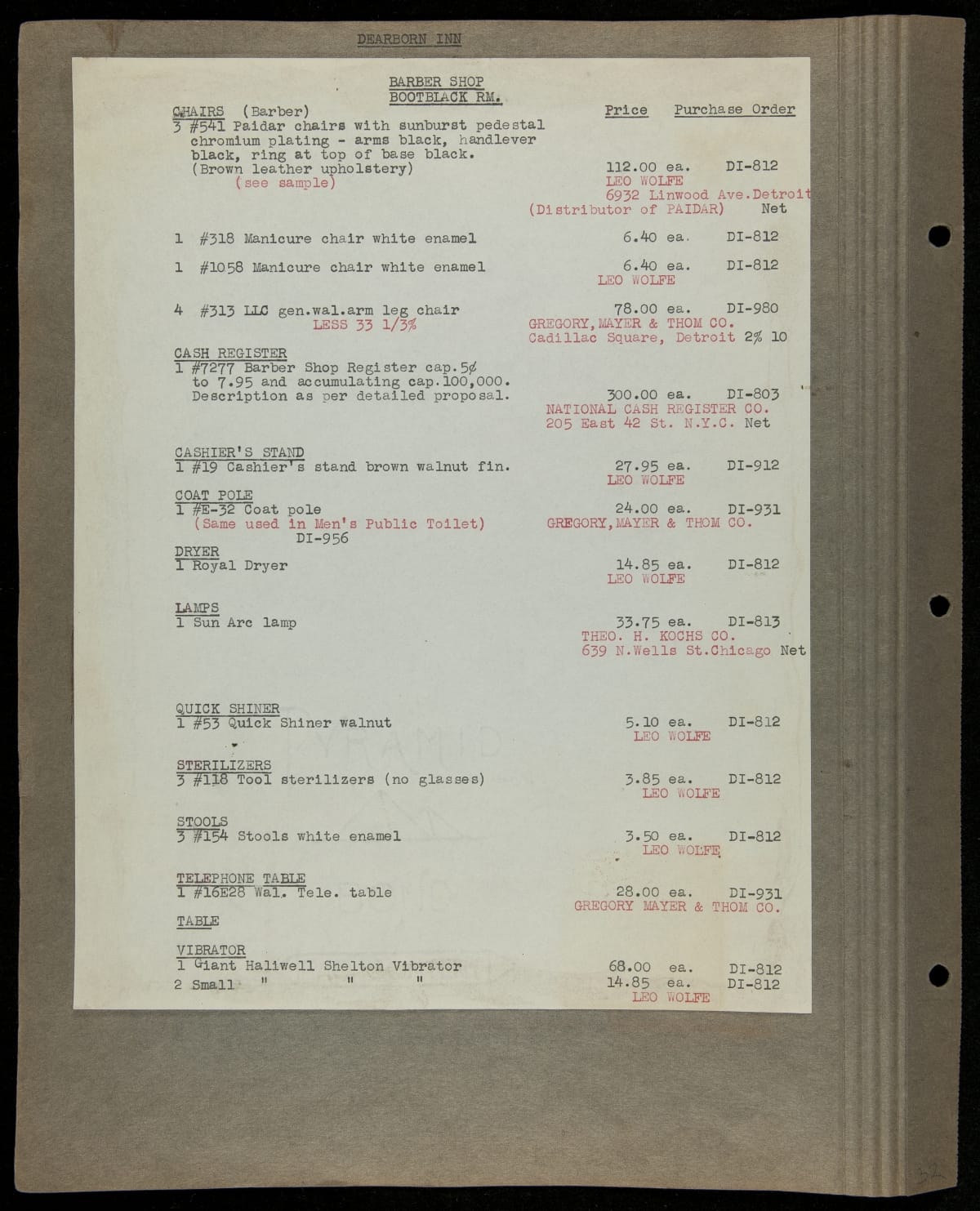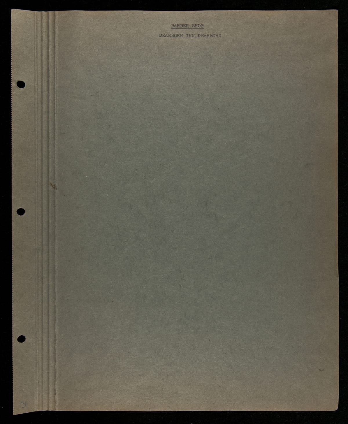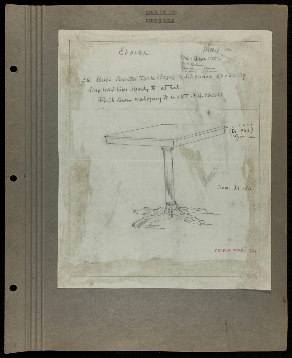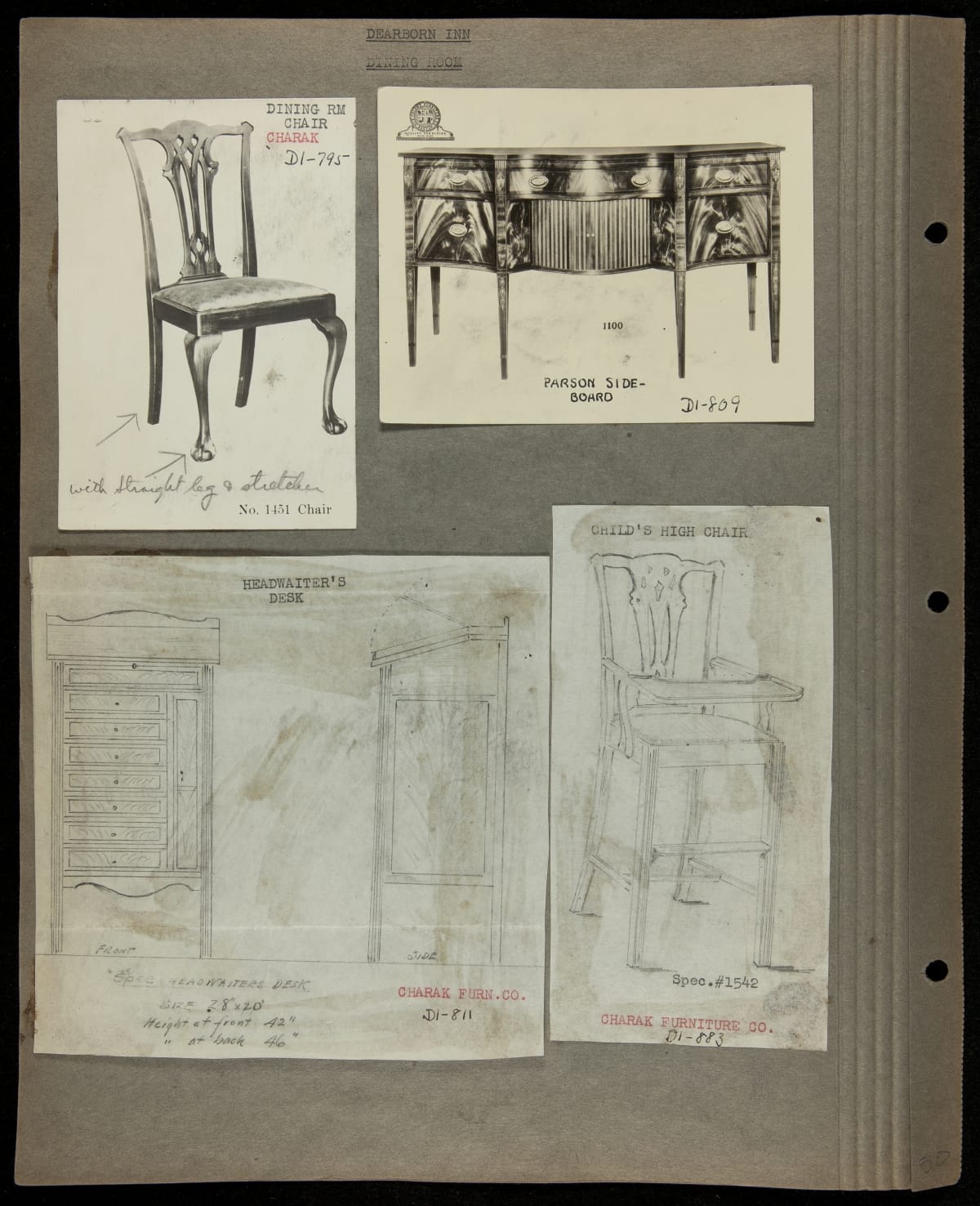 Edsel and Henry Ford conceived the Dearborn Inn as their vision of a "real New England Inn" -- a first class hotel hosting travelers transiting through the adjacent Ford Airport. It is noted as one of the first airport hotels. This loose-leaf scrapbook meticulously records the original furnishings through photographs, documents, blueprints and material samples.